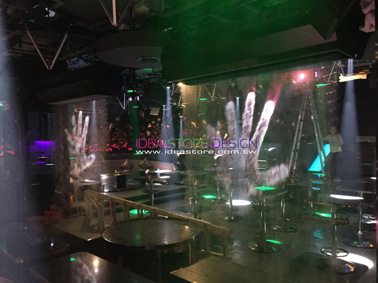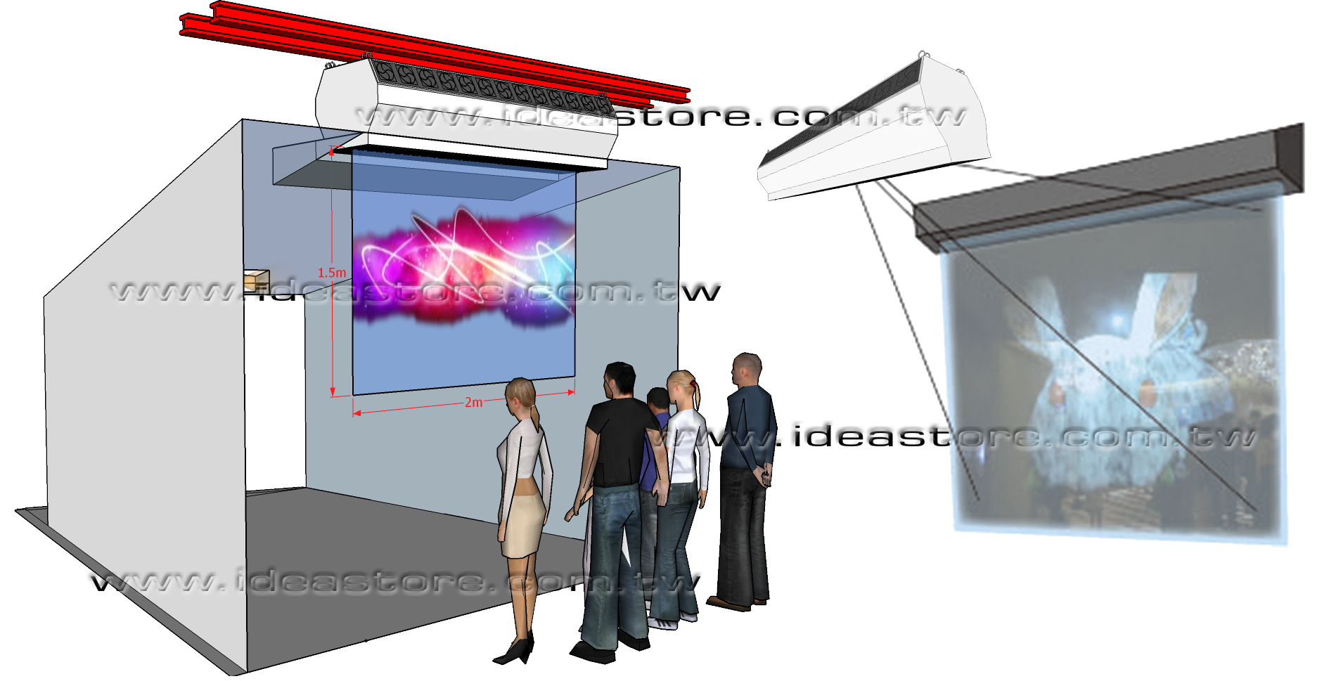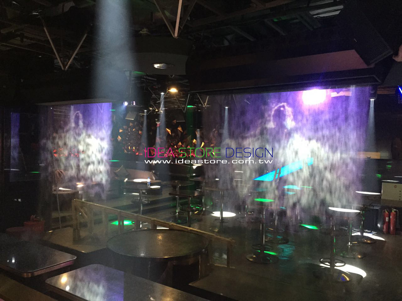 ※ 可將電腦、程式、紅外線、鐳射通過投影機光速通過風場投射到霧幕上,形成多種動感、虛擬多種圖像。